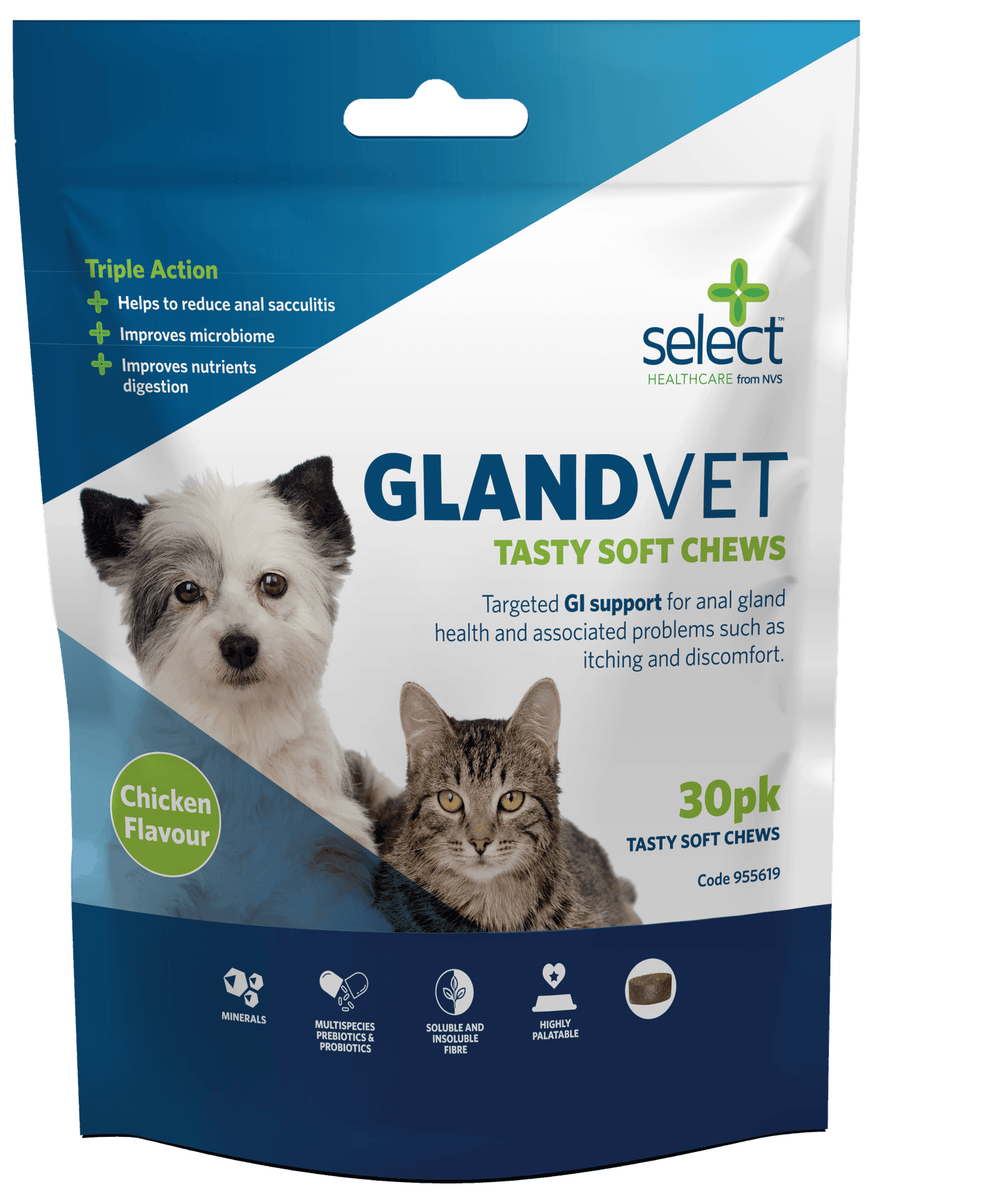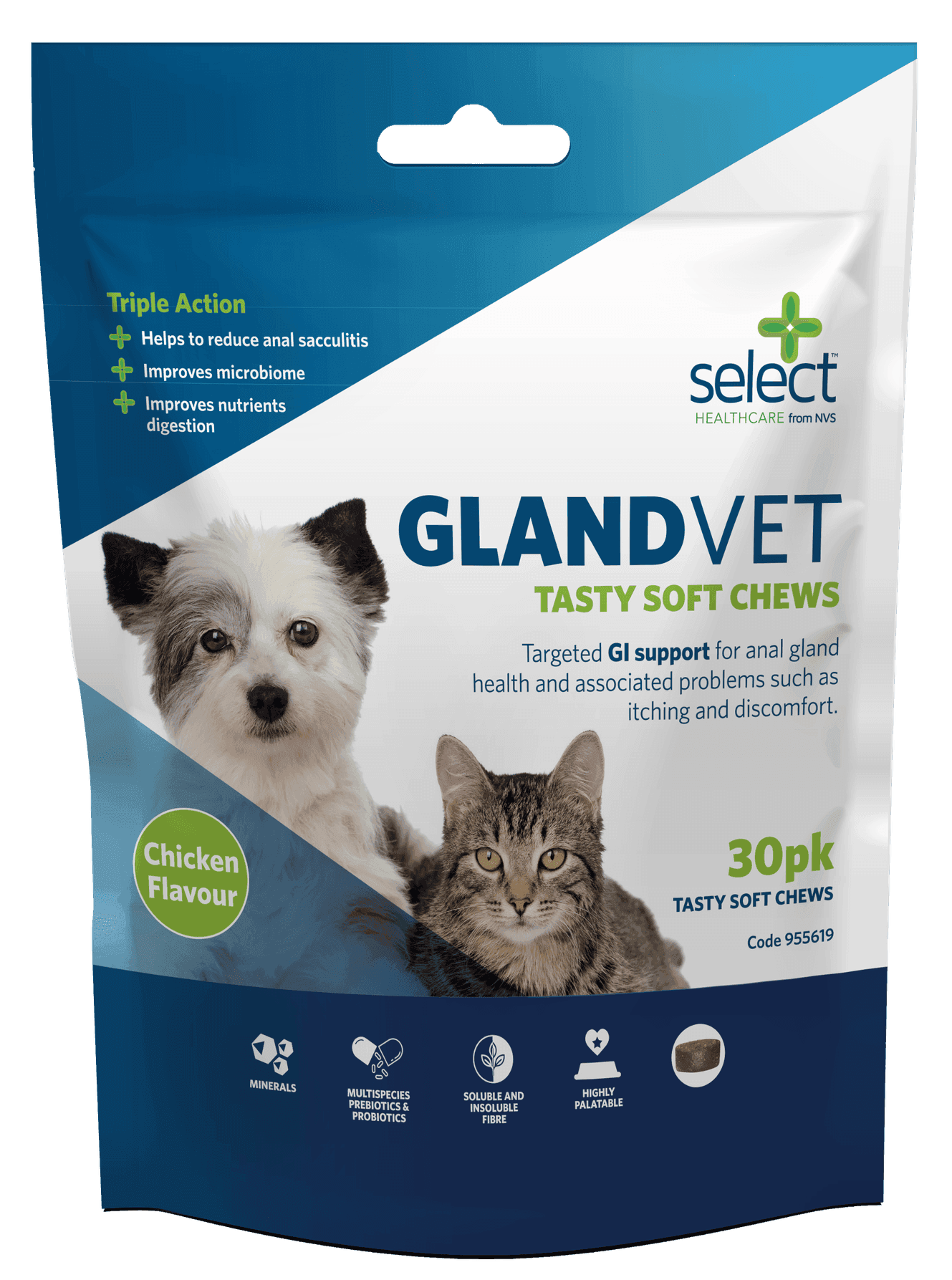 GlandVet by Select from NVS is a nutritional supplement targeted for anal gland health as it contains a balanced amount of fibres and probiotics which supports long-term anal gland function.
