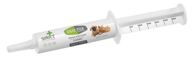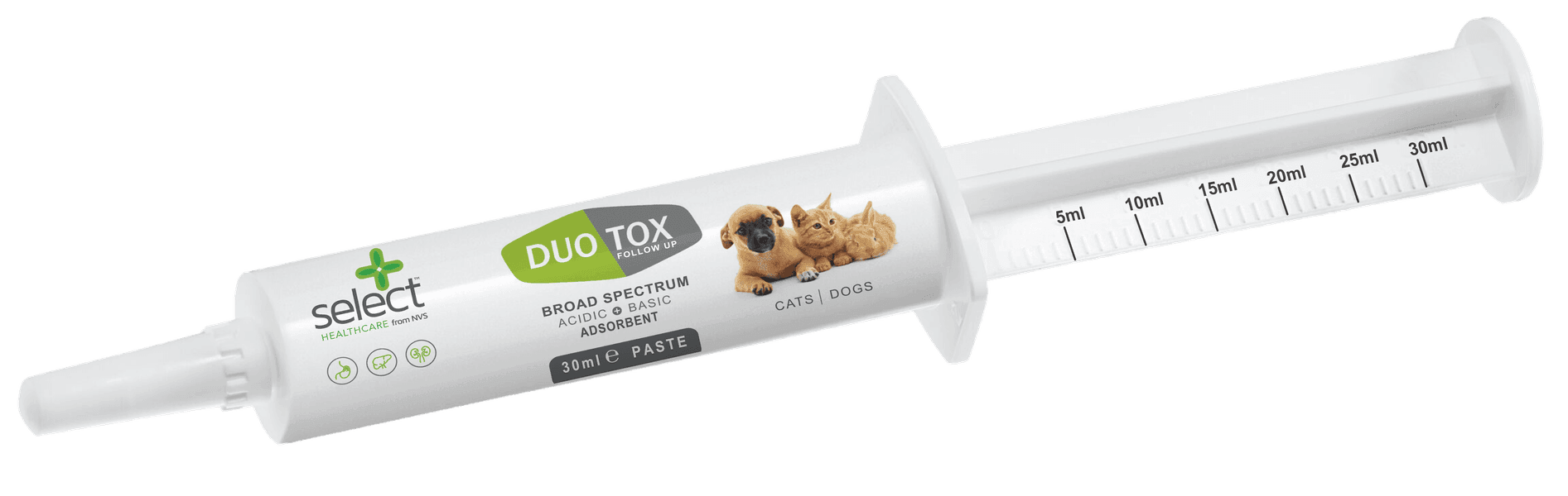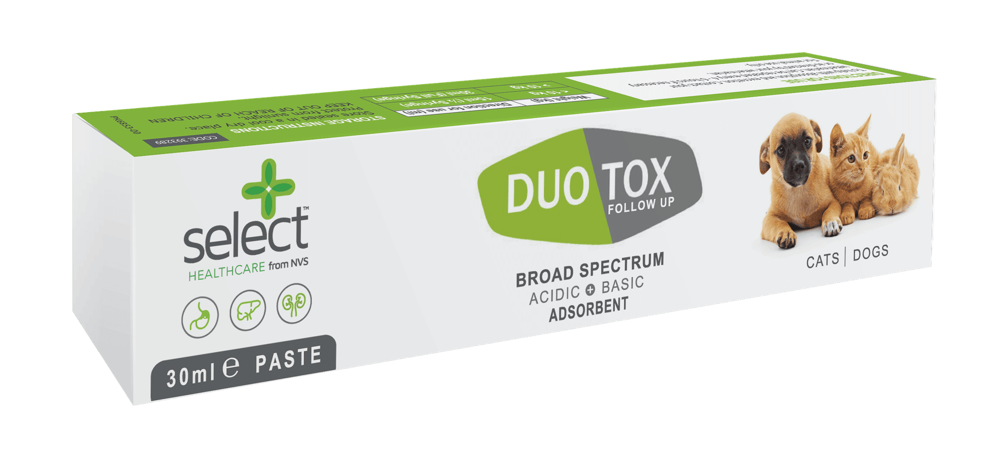 While activated charcoal plays an important role in cases of many toxin ingestions, there are some situations where it is ineffective. For these moments, when the owner is unsure of the toxin, or in cases when the vet is unsure if the toxin is acidic or alkaline in nature, using a broad spectrum binder such as Duotox by Select from NVS is beneficial.