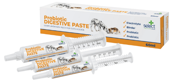 A low fat and highly digestible gastro-intestinal support diet is beneficial, along with products that supply pre and probiotics, such as Probiotic Digestive Paste by Select from NVS. This product also includes disomectite, which helps to absorb water and potential pathogens, dextrose and glucose as energy sources, and electrolytes to help restore and maintain those that have been lost through dehydration.
