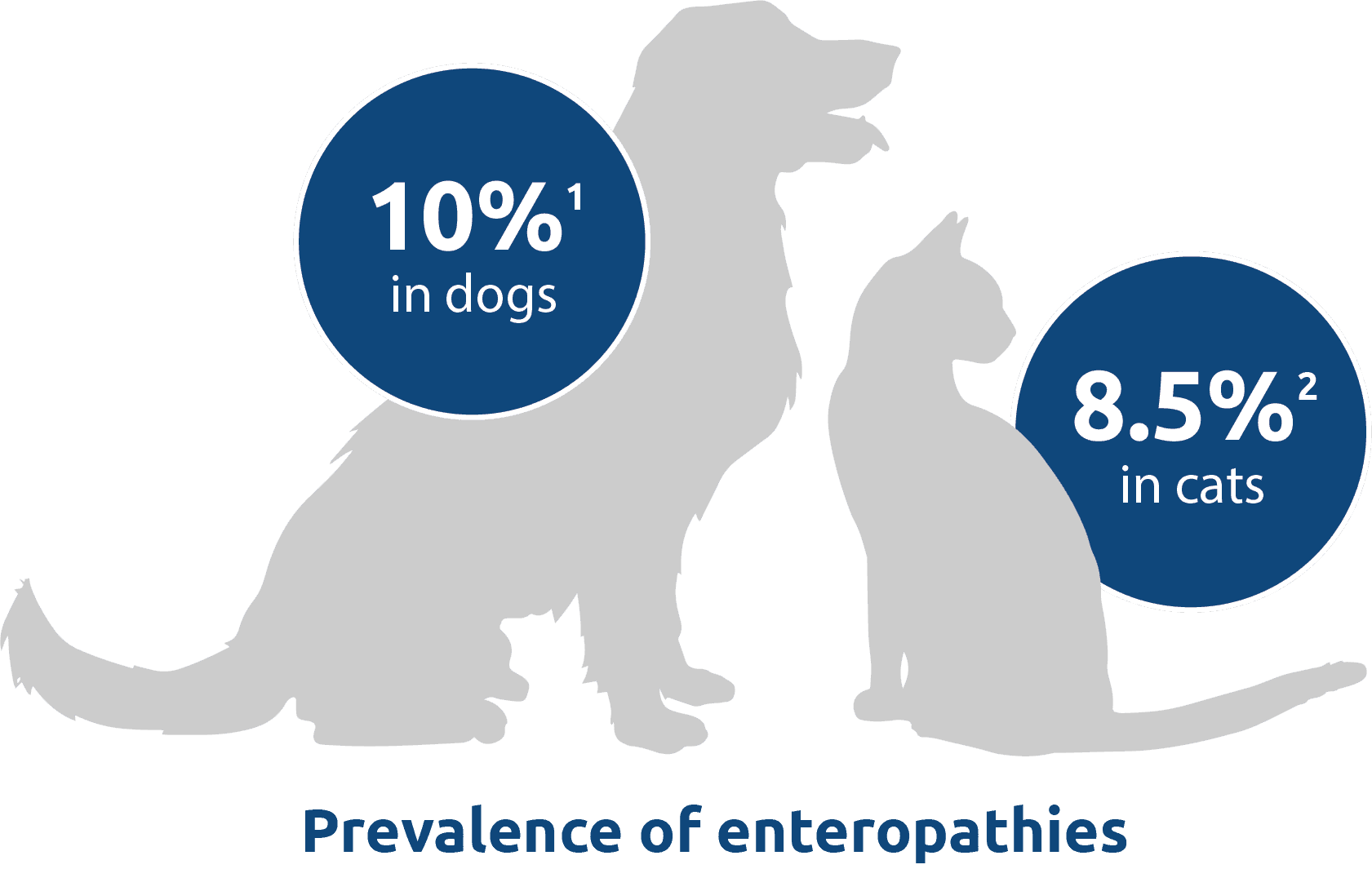 Gastrointestinal disorders are another highly seen condition, with the prevalence of enteropathies in dogs reported to be 10%3 and in cats approximately 8.5%4. Whereas historically, antibiotics were heavily prescribed in cases of diarrhoea, we now know that most acute cases of diarrhoea are not caused by pathogenic bacteria5. Instead we have seen a shift to treating dysbiosis with dietary modifications and nutraceuticals.