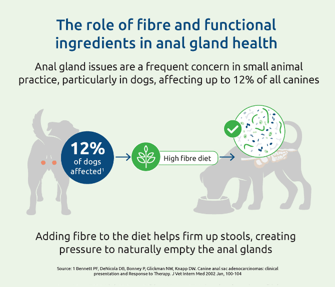 Dietary modification, specifically increased fibre, helps to produce firm well-formed stools which provide the necessary pressure to naturally express the anal glands during defecation, reducing the likelihood of impaction.