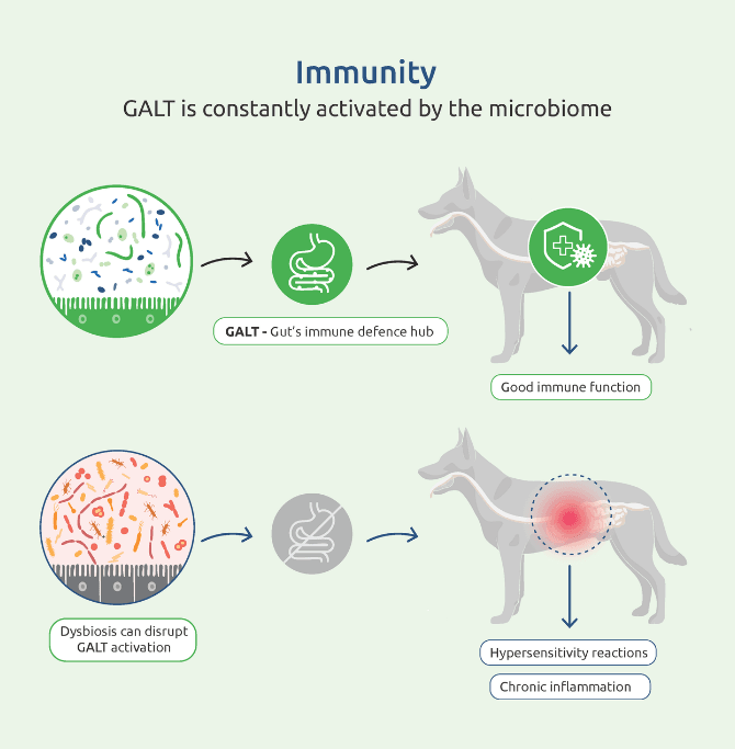 Approximately 70–80% of the immune system resides in the gut-associated lymphoid tissue (GALT). This means the GI tract is not only a digestive organ but also a critical hub for immune regulation. Microbial signals help the immune system distinguish between harmless antigens and true threats, shaping the body’s tolerance and inflammatory responses. Dysbiosis is increasingly linked to chronic diseases in pets: