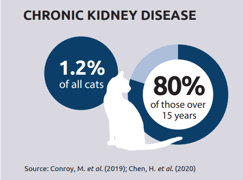Chronic kidney disease (CKD) is one of the most prevalent conditions affecting senior pets – particularly cats. Its prevalence increases significantly with age, affecting approximately 1% of the general feline population8, but rising to as high as 80% in cats older than 15 years9.